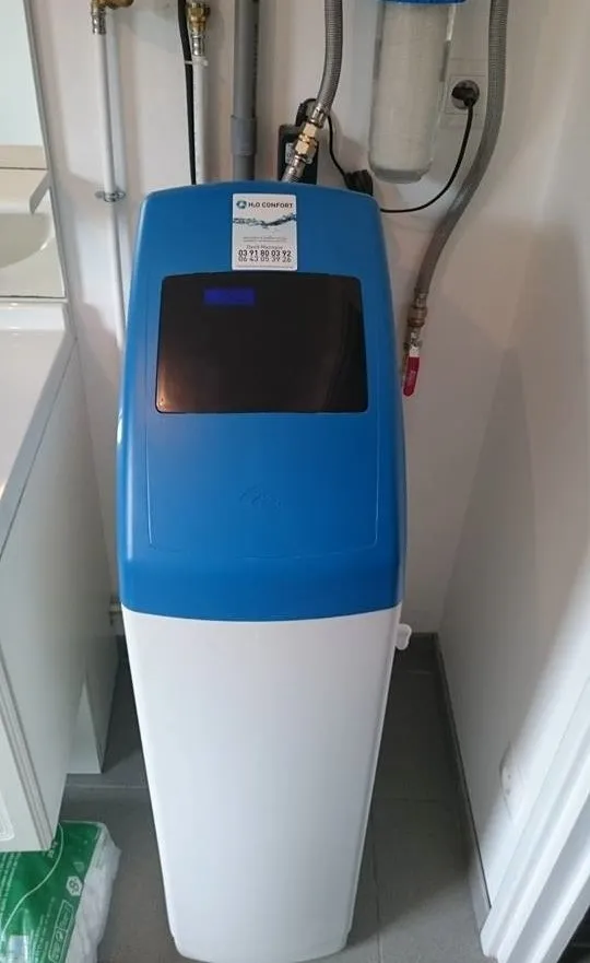 L’eau traverse une résine échangeuse d’ions qui retient les ions responsables de la dureté. Quand la résine est saturée, l’adoucisseur effectue une régénération : une solution d’eau salée (saumure) recharge la résine pour qu’elle retrouve sa capacité d’échange.