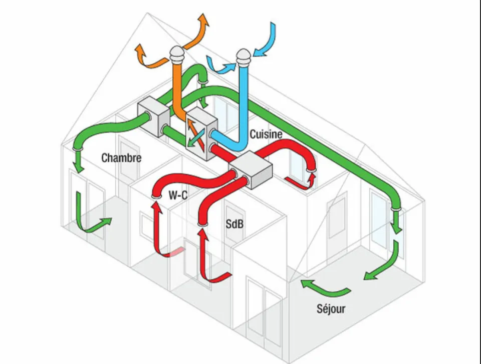 Une VMC double flux renouvelle l’air de la maison avec deux réseaux de gaines : elle extrait l’air vicié (cuisine, salle de bain, WC) et insuffle de l’air neuf dans les pièces de vie. Son cœur, c’est un échangeur de chaleur : il récupère l’énergie de l’air extrait pour pré-chauffer l’air entrant, ce qui améliore le confort tout en limitant les pertes.