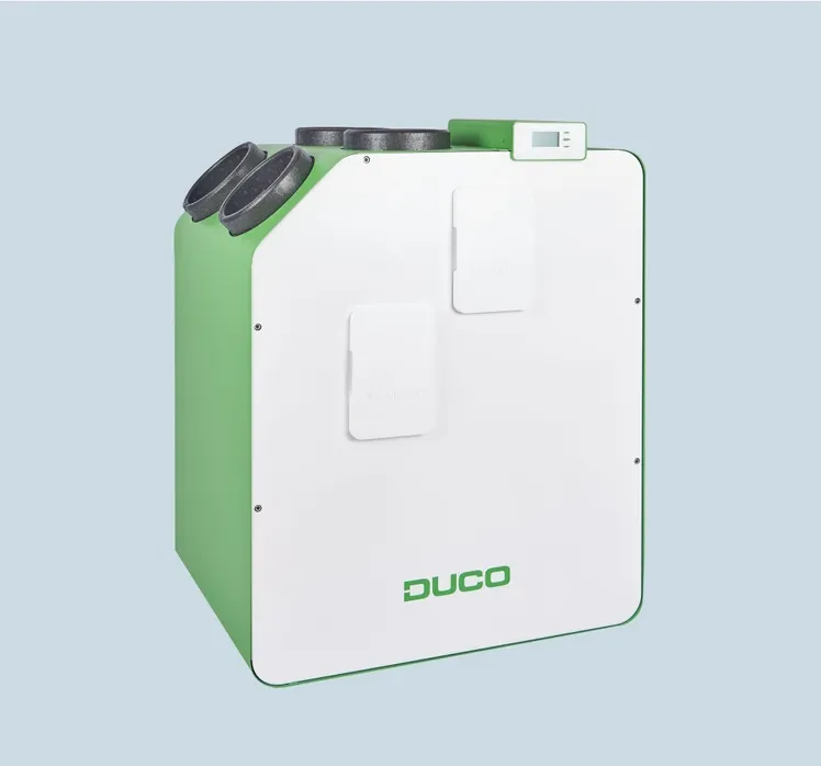 La DucoBox Energy Premium est une VMC double flux avec récupération de chaleur : elle insuffle de l’air neuf et extrait l’air vicié, tout en récupérant la chaleur de l’air extrait pour la transférer à l’air entrant. Résultat : un air intérieur plus sain, avec des pertes de chaleur limitées et un confort plus stable.